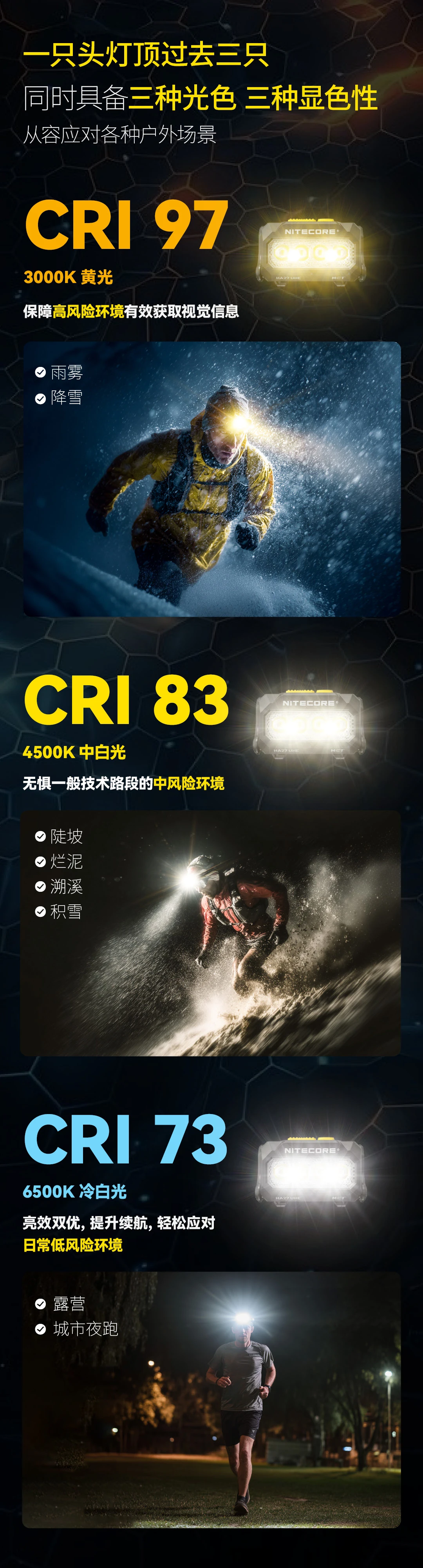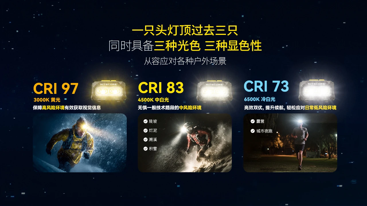 3000K黄光 CRI 97, 4500K中白光 CRI 83, 6500K冷白光 CRI 73