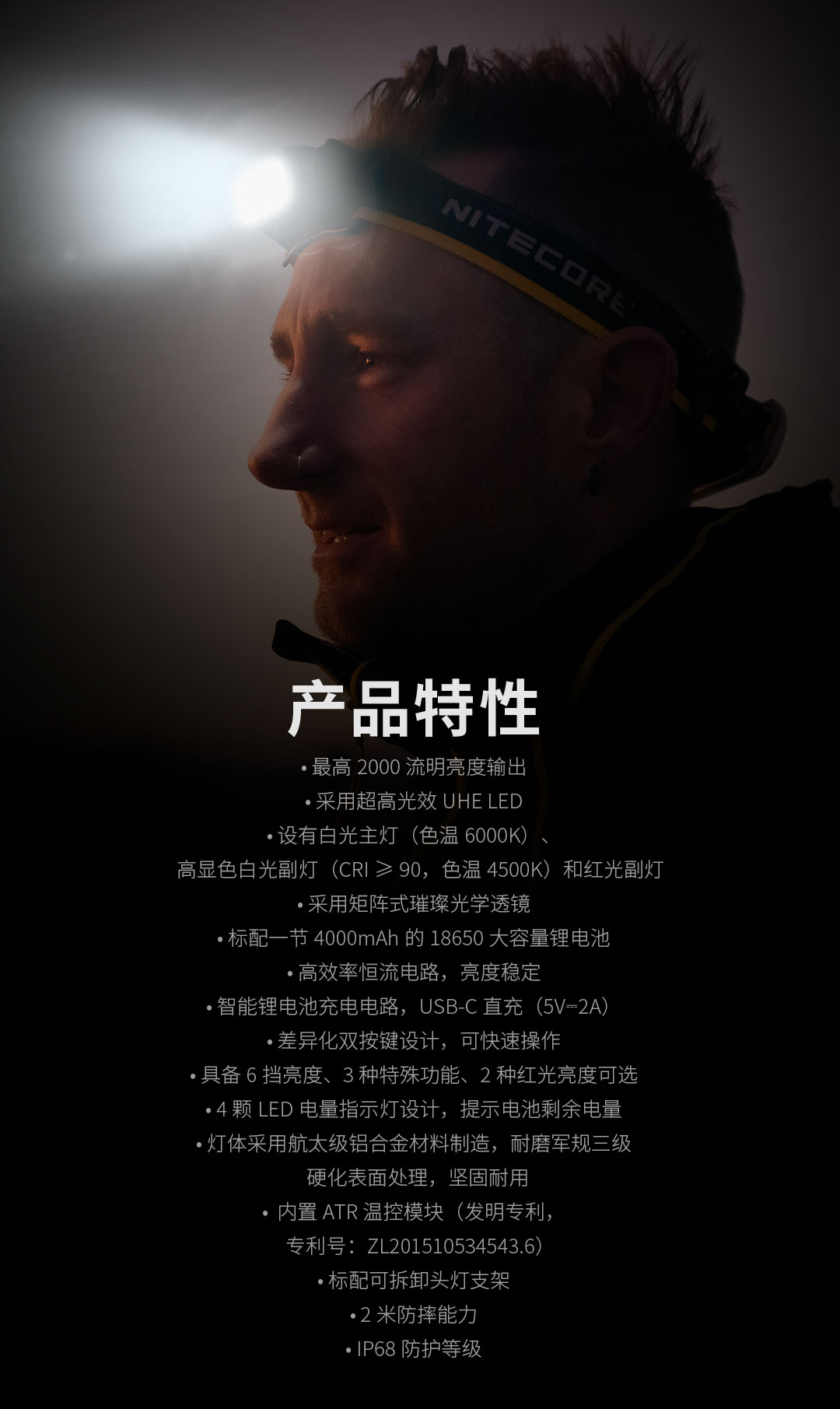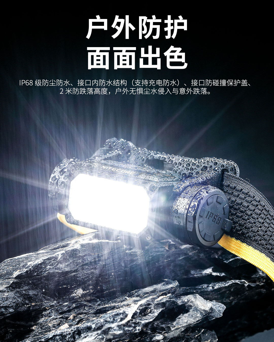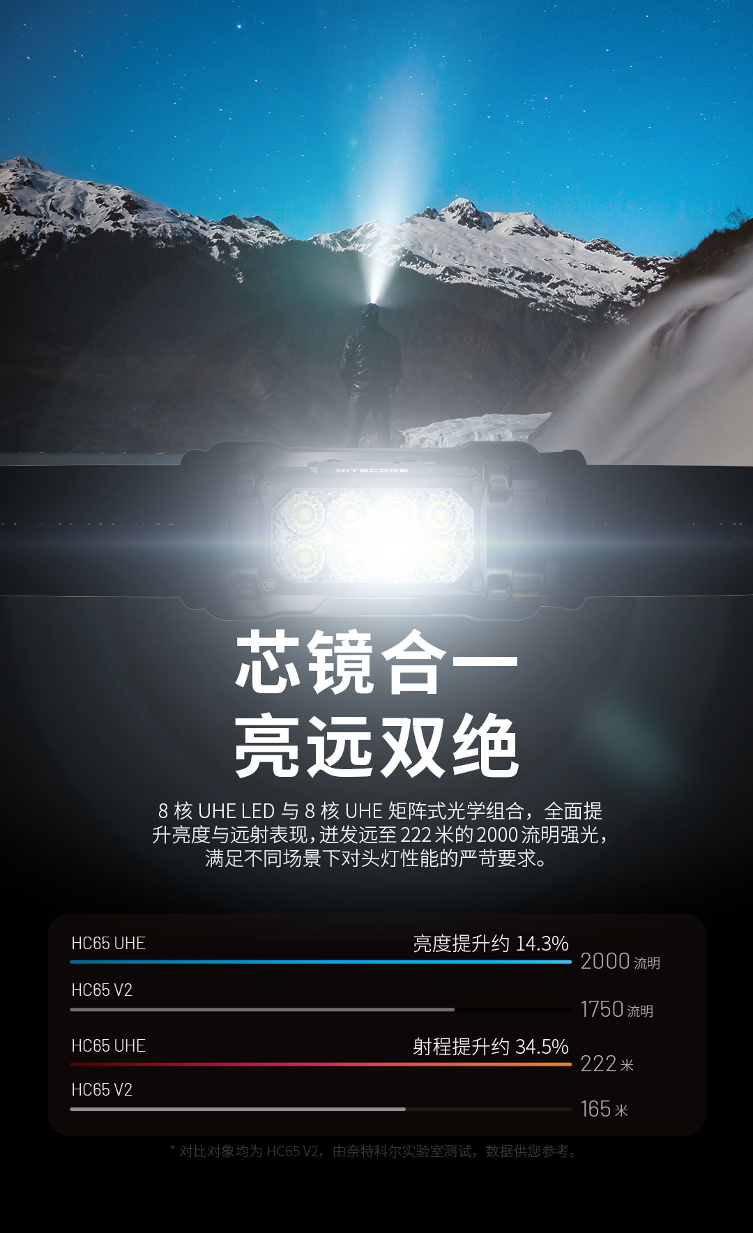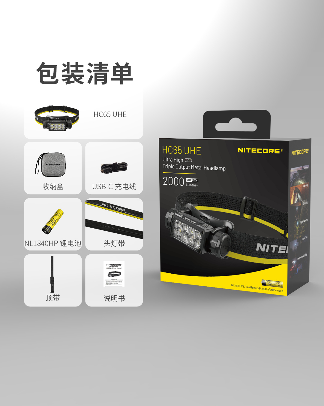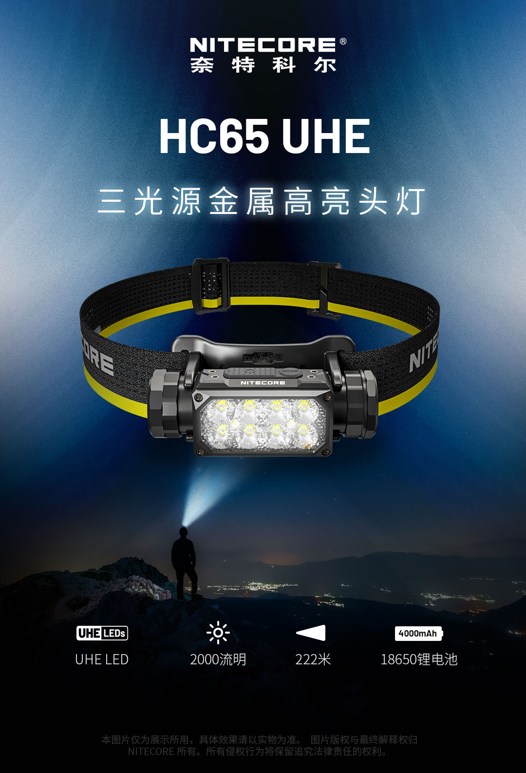 奈特科尔HC65 UHE三光源金属高亮头灯,首发超高光效UHE LED,8核架构最高2000流明输出,标配4000mAh 18650锂电池,拥有IP68级防尘防水与2米防跌落高度。
