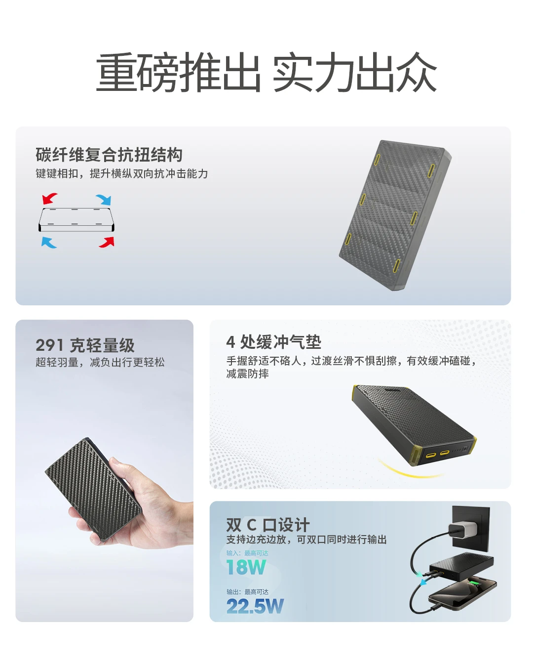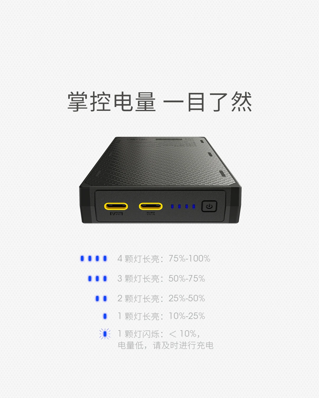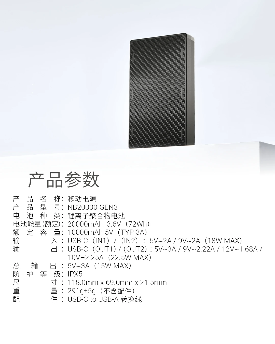 输出:USB-C(OUT1)/(OUT2):5V⎓3A / 9V⎓2.22A /12V⎓1.68A / 10V⎓2.25A(22.5W MAX)