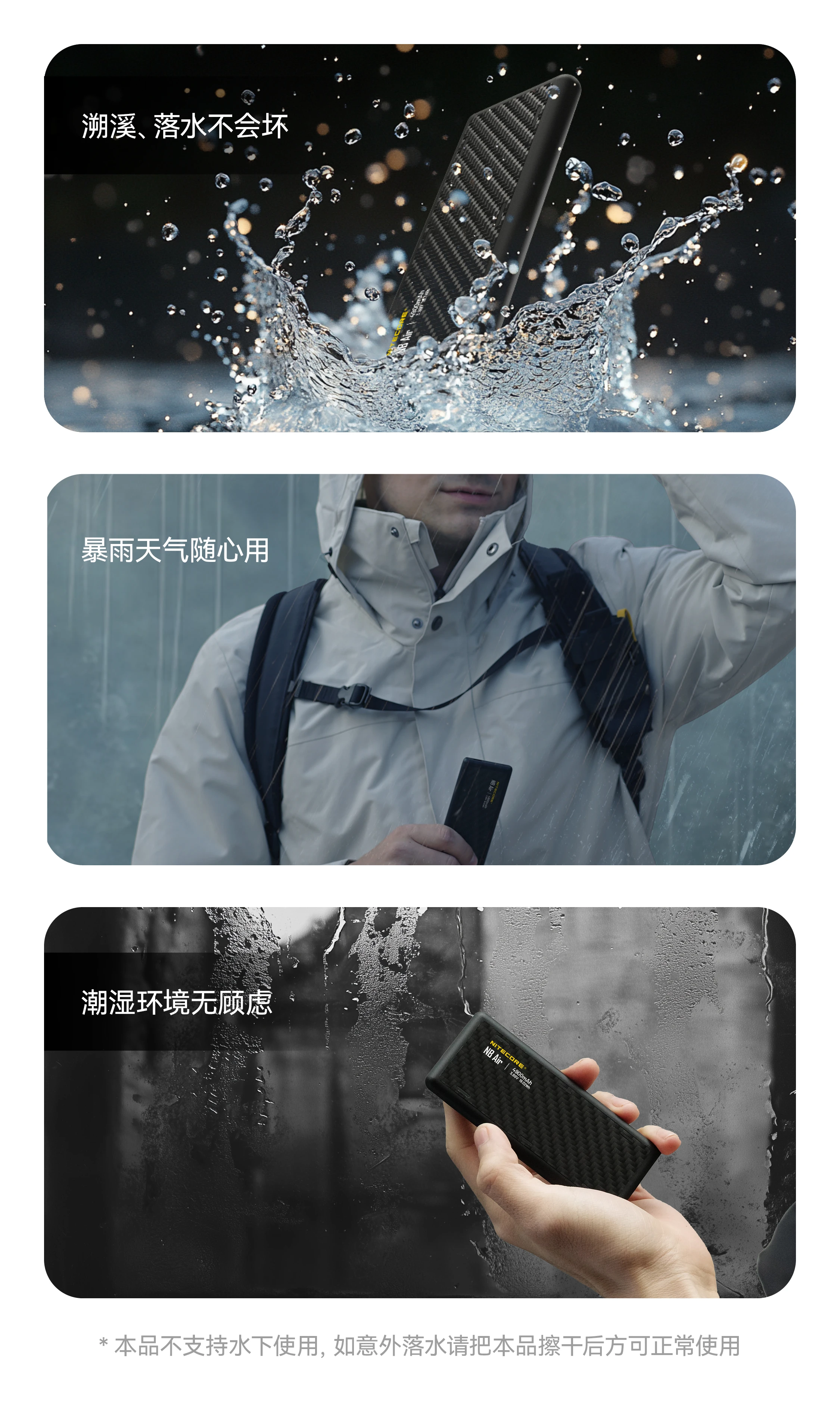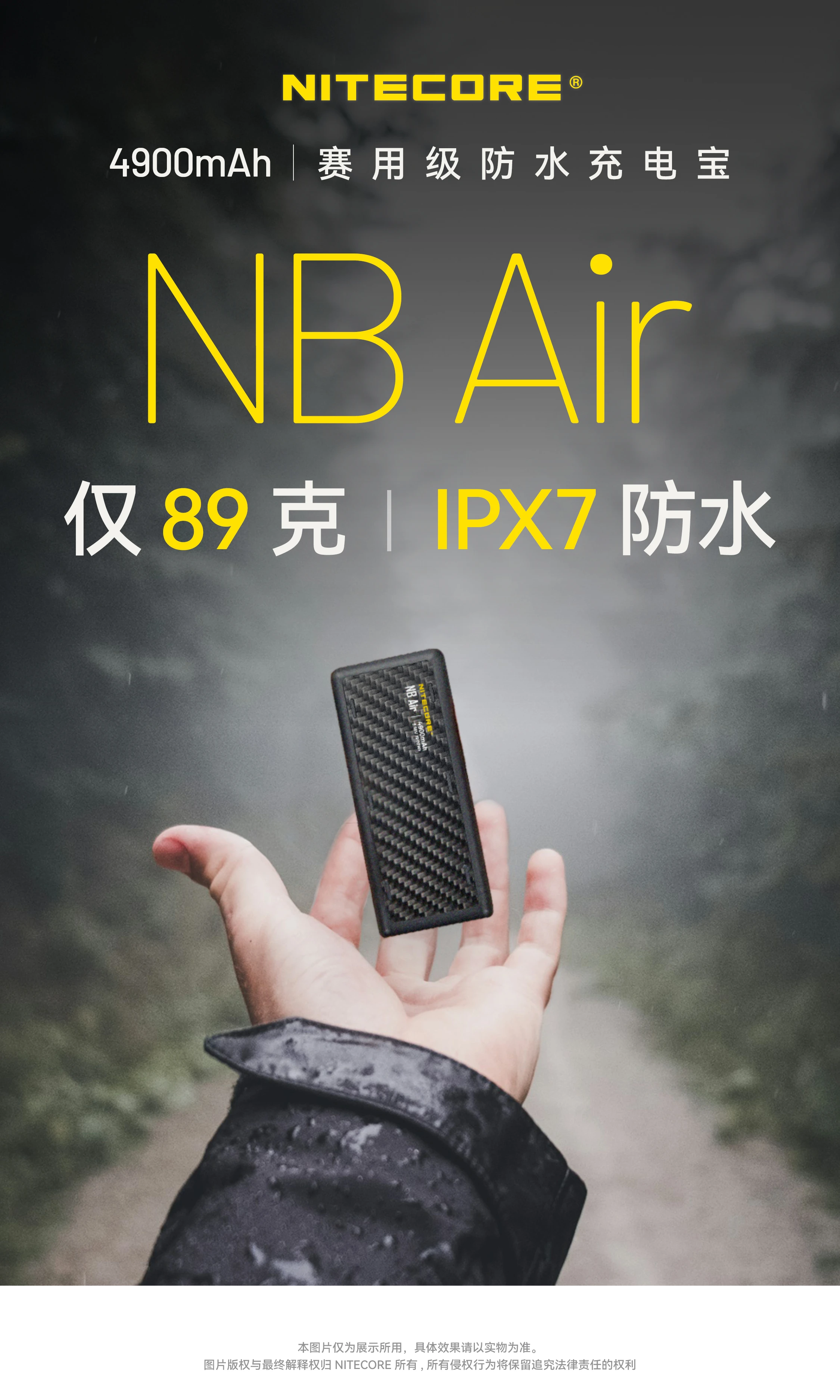 NITECORE奈特科尔NB Air 4900mAh赛用级防水充电宝,以仅89克与IPX7的超轻薄强防水组合设计,成为户外玩家的可靠补能搭子。