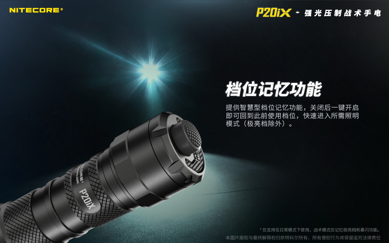 X世代强光压制战术手电P20iX,4000流明强光,221米精准远射,专业战术与创新科技的融合,采用进口高光效的CREE XP-L2 V6 LED 、21700 i智能供电架构、第二代“STROBE READY ™”操控系统、先进i电池智能供电架构、支持更多i系列智能扩展模块,适用于执法行动、突围抓捕、战术防卫、搜索巡逻等使用场景。