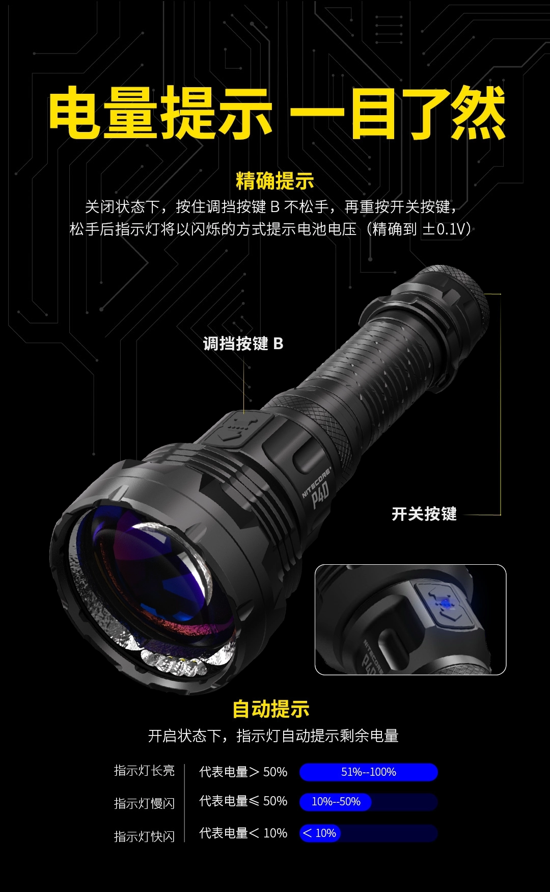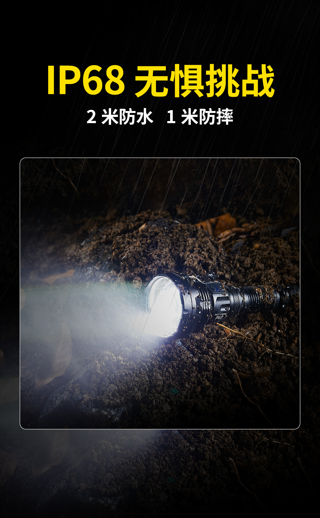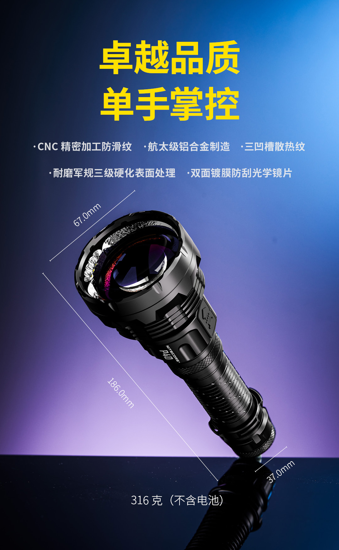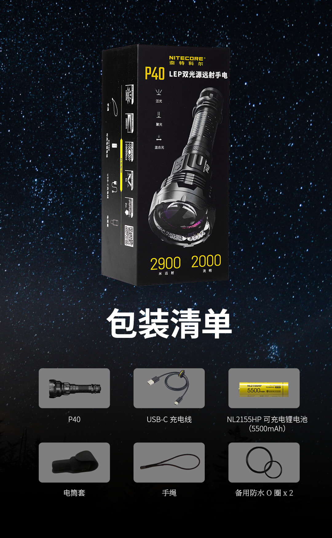 奈特科尔P40 LEP双光源远射手电,聚光、泛光、混合光随心切换,至高2900米远射和2000流明强光输出,同时设有支持自动快速调光的自巡航模式,多场景适用,无惧距离限制,精准必达。